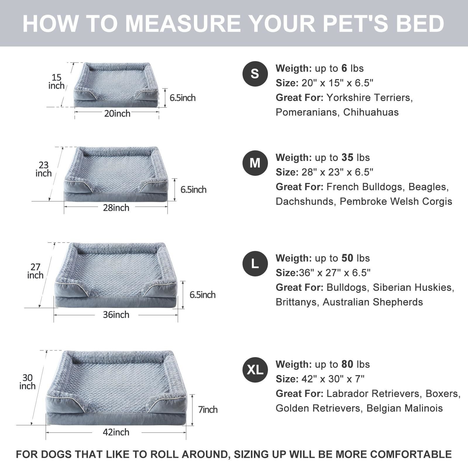Size: (Dog beds for large dogs) 36x27x6.5 inch dog bed large size dog could load-bearing less than 50lbs .For dogs that like to roll around, sizing up will be more comfortable.