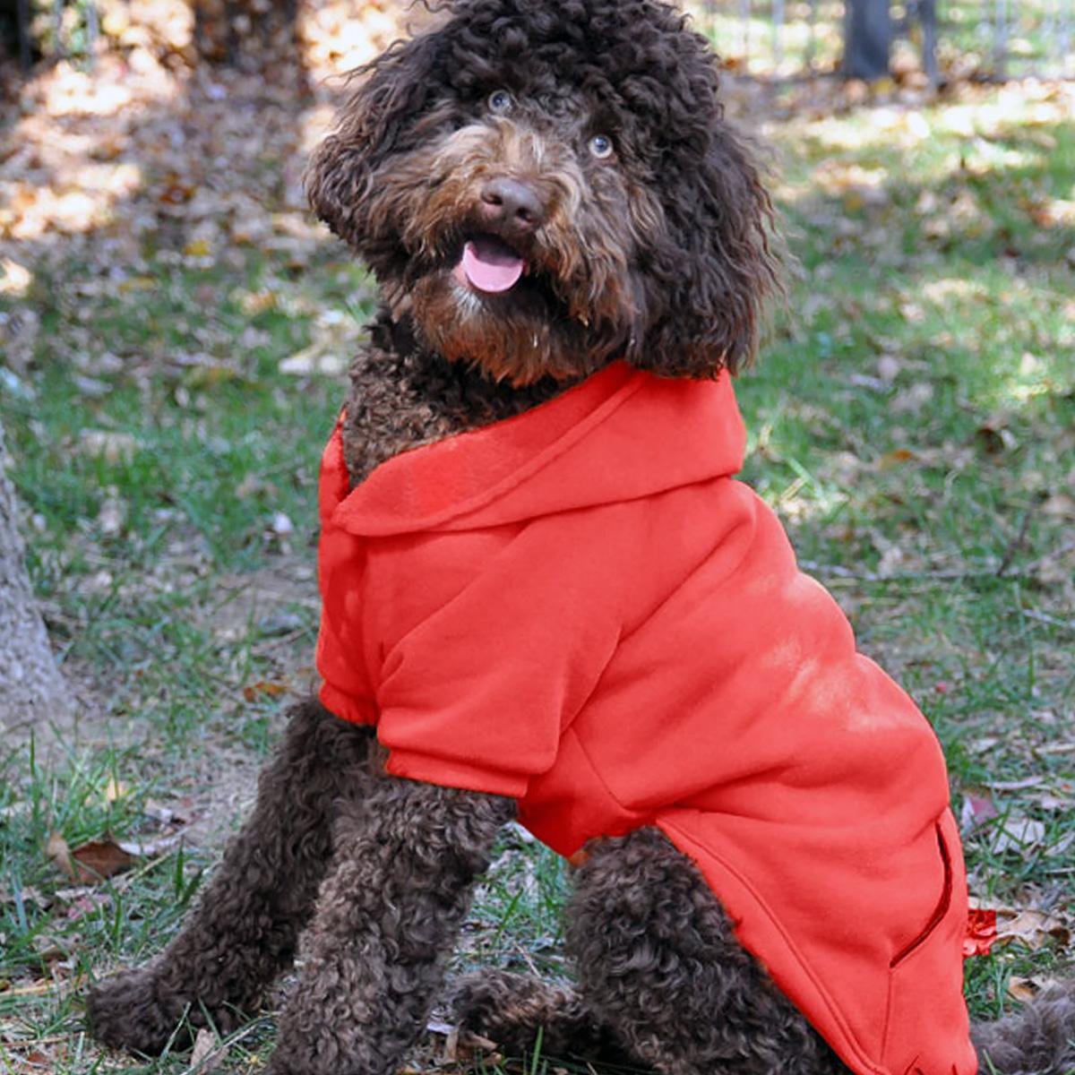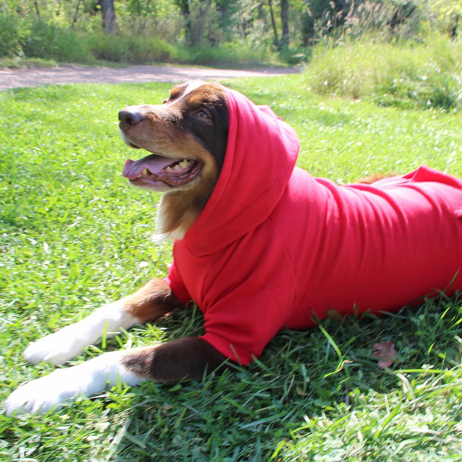 Your pup will love the comfort and style of this Doggie Design wardrobe essential. With the flexible fabric and ribbed trim, even hard-to-fit dogs will love the style of this pullover hoodie. We have used human-grade high-quality thicker material (290  GSM - gram per square meter) not usually seen in pet garments. This makes our dog hoodies a cozy choice for colder climates with the thick, plush material. The leash access hole at the base of the hood makes walks a breeze for dogs that prefer their hoods worn up or for pups that use a harness.